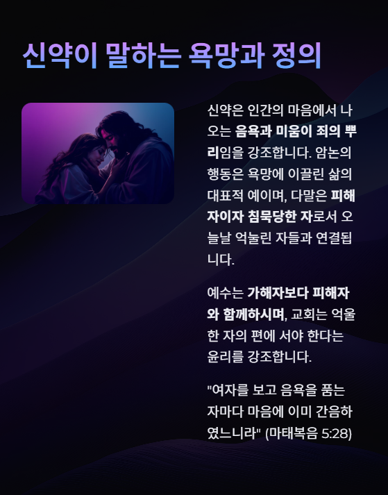 신약은 인간의 마음에서 나오는 음욕과 미움이 죄의 뿌리임을 강조합니다. 암논의 행동은 욕망에 이끌린 삶의 대표적 예이며, 다말은 피해자이자 침묵당한 자로서 오늘날 억눌린 자들과 연결됩니다. 예수는 가해자보다 피해자와 함께하시며, 교회는 억울한 자의 편에 서야 한다는 윤리를 강조합니다.