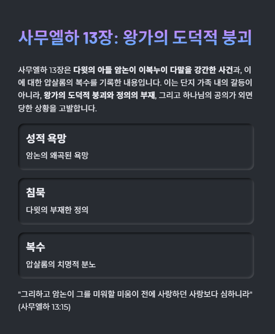 사무엘하 13장은 다윗의 아들 암논이 이복누이 다말을 강간한 사건과, 이에 대한 압살롬의 복수를 기록한 내용입니다. 이는 단지 가족 내의 갈등이 아니라, 왕가의 도덕적 붕괴와 정의의 부재, 그리고 하나님의 공의가 외면당한 상황을 고발합니다. 본 장은 성적 욕망, 침묵, 분노, 복수의 악순환을 통해 죄의 확산과 그 치명적 결과를 드러냅니다.