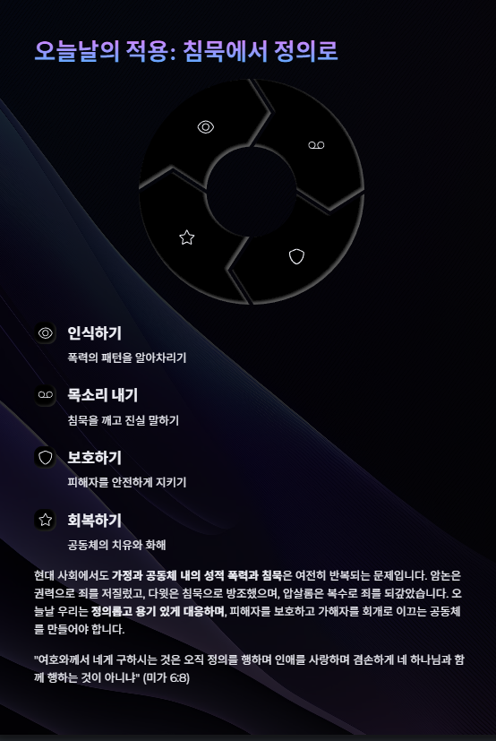 현대 사회에서도 가정과 공동체 내의 성적 폭력과 침묵은 여전히 반복되는 문제입니다. 암논은 권력으로 죄를 저질렀고, 다윗은 침묵으로 방조했으며, 압살롬은 복수로 죄를 되갚았습니다. 오늘날 우리는 정의롭고 용기 있게 대응하며, 피해자를 보호하고 가해자를 회개로 이끄는 공동체를 만들어야 합니다.