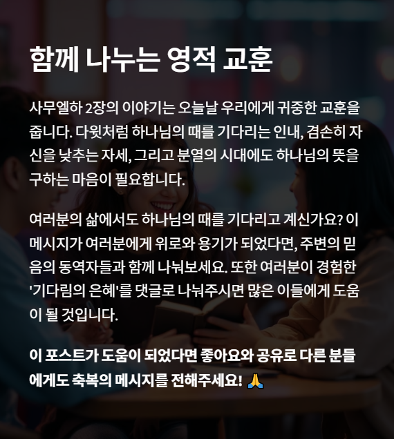 오늘날 교회와 성도들은 하나님의 시간표에 따라 기다리는 신앙의 태도를 회복해야 합니다. 성급하게 결정하거나 인간적 판단에 따라 움직이기보다, 하나님의 인도하심 속에서 겸손히 인내해야 합니다. 다윗처럼 분열의 시대에도 자신을 주장하지 않고, 하나님께서 일하실 때를 기다리는 믿음이 필요합니다. 이러한 태도가 결국 모든 혼란 속에서 하나님 나라를 이루는 길입니다.