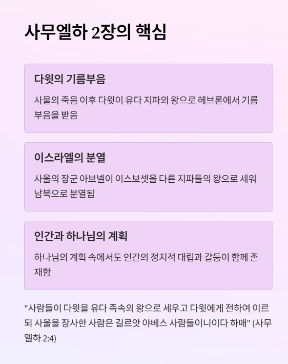 사무엘하 2장은 사울의 죽음 이후 다윗이 유다 지파의 왕으로 기름 부음을 받는 장면으로 시작합니다. 그는 헤브론에서 왕위에 오르지만, 사울의 장군 아브넬은 사울의 아들 이스보셋을 이스라엘 다른 지파들의 왕으로 세웁니다. 이로 인해 이스라엘은 남북으로 분열되고, 다윗과 이스보셋의 갈등이 시작됩니다. 본장은 하나님의 계획 속에서도 인간의 정치적 대립과 갈등이 함께 존재함을 보여줍니다.