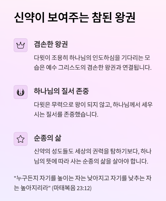 신약에서는 하나님의 나라는 세상의 정치나 권력과는 다른 방식으로 확장됩니다. 다윗이 조용히 하나님의 인도하심을 기다리며 왕위에 오르는 모습은, 예수 그리스도의 겸손한 왕권과 연결됩니다. 다윗은 무력으로 왕이 되지 않고, 하나님의 때에 하나님께서 세우시는 질서를 존중합니다. 신약의 성도들도 세상의 권력을 탐하기보다, 하나님의 뜻에 따라 사는 순종의 삶을 살아야 함을 배웁니다.