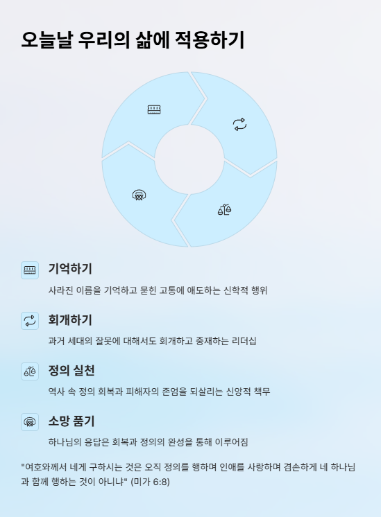 오늘날 우리는 역사 속 정의 회복과 피해자의 존엄을 되살리는 작업이 신앙과 공동체의 책무임을 본문을 통해 배웁니다. 리스바처럼 사라진 이름을 기억하고, 묻힌 고통에 애도하는 일은 신학적 행위입니다. 또한 다윗처럼 과거 세대의 잘못에 대해서도 회개하고 중재하는 리더십이 필요하며, 하나님의 응답은 회복과 정의의 완성을 통해 이뤄짐을 확신해야 합니다.