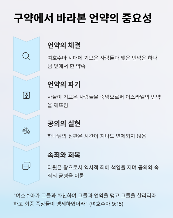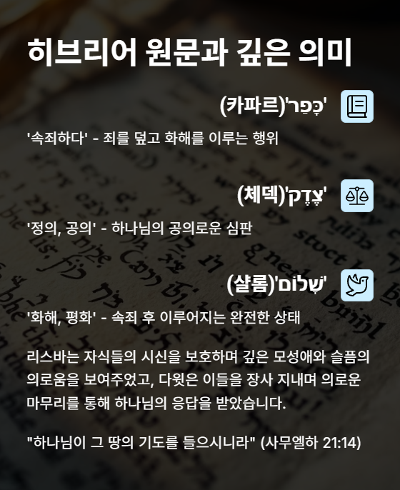 구약에서는 언약을 깨뜨린 자에 대한 하나님의 공의로운 심판이 자주 등장합니다. 기브온 사람들은 여호수아 때 언약으로 보호받은 자들이었고(여호수아 9장), 이를 어긴 사울의 죄는 시간이 지나도 하나님의 심판에서 면제되지 않았습니다. 다윗은 왕으로서 역사적 죄에 책임을 지며, 공의와 속죄의 균형을 이룹니다. 또한 리스바의 슬픔은 욥기에서처럼 인간의 고통 속에서도 존엄성을 잃지 않는 신앙인의 상징이 됩니다.