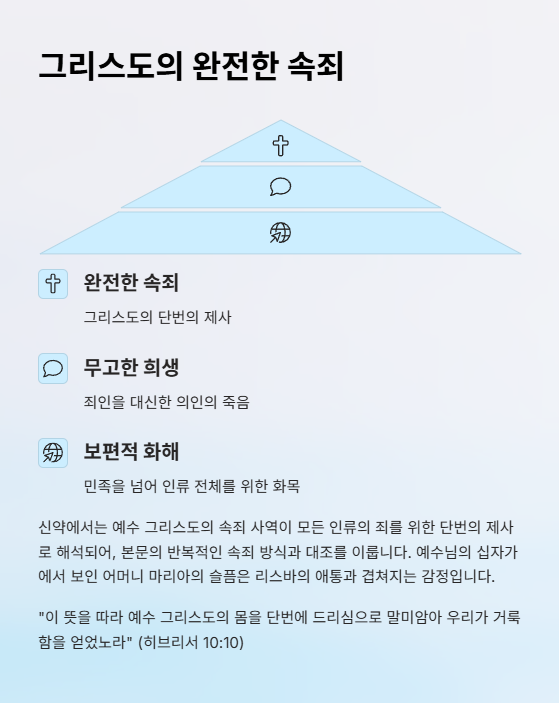 신약에서는 예수 그리스도의 속죄 사역이 모든 인류의 죄를 위한 단번의 제사로 해석되기에, 본문의 반복적인 속죄 방식과 대조를 이룹니다. 그리스도는 무고한 자로서 죄인을 대신해 죽으셨고, 리스바의 자식들과 같은 존재가 되었으며, 하나님의 사랑은 단지 민족적 화해를 넘어 인류 전체를 위한 화목의 제사로 완성됩니다. 또한 예수님의 십자가에서 보인 어머니 마리아의 슬픔은 리스바의 애통과 겹쳐지는 감정입니다.