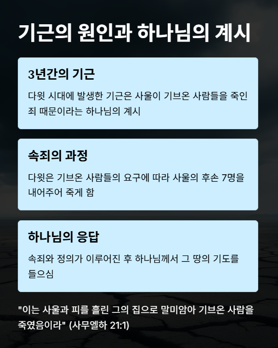 다윗은 하나님께 기근의 원인을 묻고, 사울 왕이 기브온 사람들을 무고히 죽인 죄 때문이라는 계시를 받습니다. 그는 그들의 요청대로 사울의 자손 일곱을 넘겨주고, 이들이 죽임당함으로써 속죄가 이루어집니다. 이 장면은 하나님의 공의가 역사적 약속의 파괴에 대한 응답으로 나타난 사례이며, 동시에 리스바라는 여인이 자식들의 시신을 보호하며 깊은 모성애와 슬픔의 의로움을 보여주는 장면이기도 합니다. 이후 다윗은 이들을 장사 지내며 의로운 마무리를 통해 하나님의 응답을 받습니다.