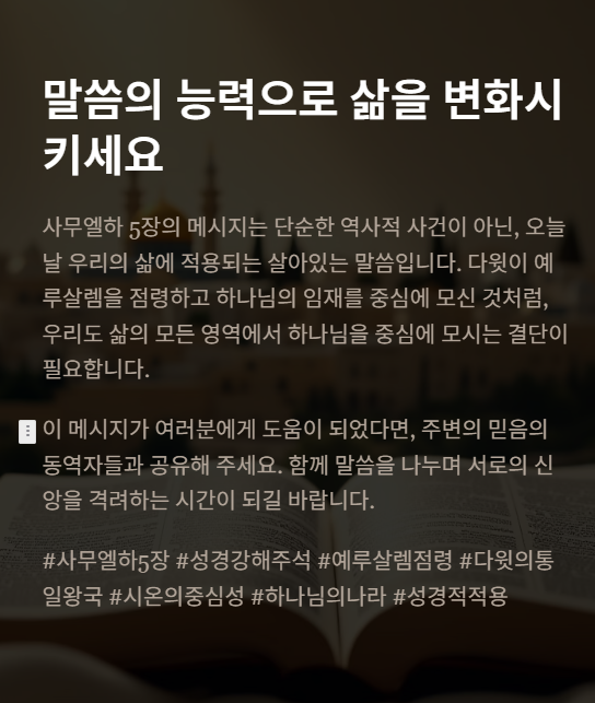 오늘날 신앙인은 다윗처럼 하나님의 때와 질서에 따라 움직이는 리더십을 배워야 합니다. 또한 교회나 공동체가 중심을 잡기 위해서는 인간의 전략보다 하나님의 인도와 임재에 집중해야 합니다. 예루살렘 점령은 단순한 승리가 아니라, 하나님을 중심에 모시는 삶이 진정한 승리임을 가르쳐 줍니다. 우리도 각자의 삶의 ‘시온’을 점령하며, 하나님 나라를 확장하는 사명을 잊지 말아야 합니다.