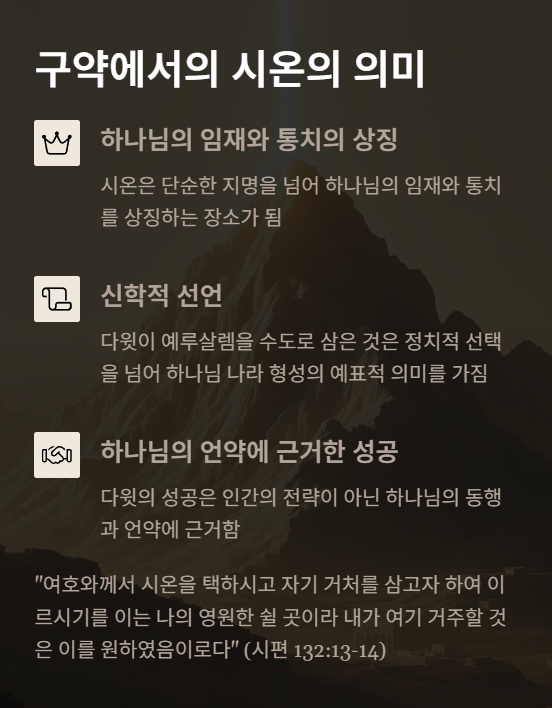 구약에서 시온은 하나님의 임재와 통치를 상징하는 지명이 됩니다. 다윗이 예루살렘을 수도로 삼은 것은 정치적 선택을 넘어 신학적 선언이기도 합니다. 이는 하나님께서 다윗을 통해 하나님의 나라를 형성하신다는 예표적 의미를 갖습니다. 다윗의 성공은 인간의 전략이 아니라 하나님의 동행과 언약에 근거한 것임을 분명히 합니다.