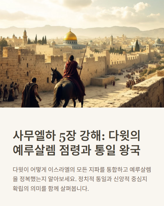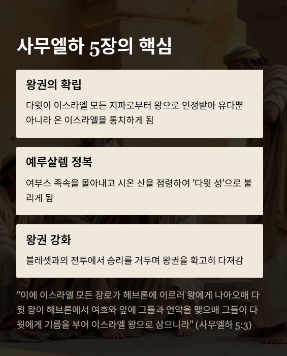 사무엘하 5장은 다윗이 이스라엘 모든 지파로부터 왕으로 인정받고, 예루살렘을 정복하는 장면을 기록합니다. 이로써 그는 유다뿐 아니라 온 이스라엘을 통치하게 되며, 정치적·영적 중심지로 예루살렘이 부각됩니다. 다윗은 여부스 족속을 몰아내고 시온 산을 점령하며, 이곳이 ‘다윗 성’으로 불리게 됩니다. 또한 블레셋과의 전투에서도 승리를 거두며 왕권을 확고히 다져갑니다.