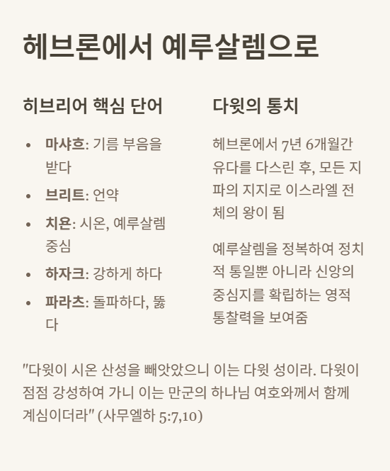 다윗은 헤브론에서 7년 6개월간 유다를 다스린 뒤, 모든 지파의 지지를 받아 이스라엘 전체의 왕으로 등극합니다. 그는 여부스 족속의 요새였던 시온 산, 곧 예루살렘을 정복하고 그곳을 왕궁과 행정의 중심지로 삼습니다. 이는 정치적 통일뿐 아니라 신앙의 중심지를 확립하려는 영적 통찰력을 보여줍니다. 또한 블레셋과의 전쟁에서 하나님의 인도하심을 받아 승리를 거두며, 그의 통치는 하나님의 능력 위에 세워졌음을 입증합니다.