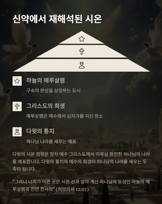 신약에서는 시온이 하늘의 예루살렘, 즉 구속의 완성을 상징하는 도시로 재해석됩니다. 다윗의 시온 점령은 장차 예수 그리스도께서 이루실 완전한 하나님의 나라를 예표합니다. 예루살렘은 그리스도께서 십자가를 지신 장소로, 다윗의 통치와 예수의 희생이 하나님의 나라를 세우는 두 축이 됩니다.