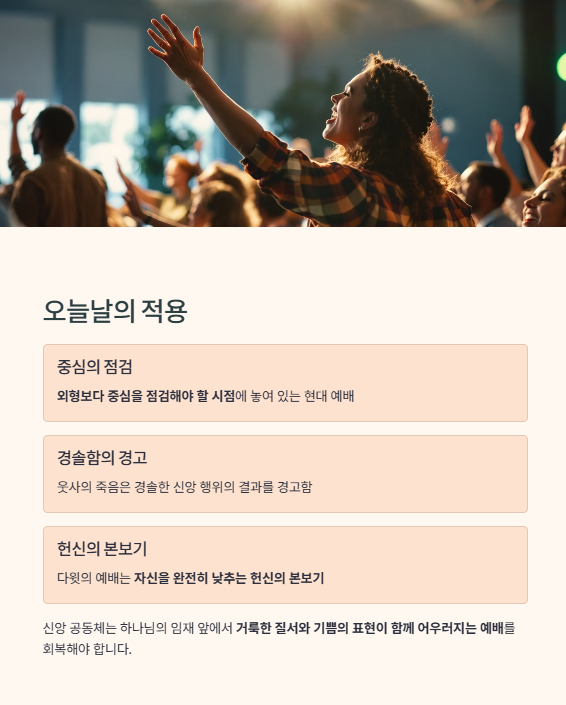 오늘날 예배는 외형보다 중심을 점검해야 할 시점에 놓여 있습니다. 웃사의 죽음은 경솔한 신앙 행위의 결과를 경고하며, 다윗의 예배는 자신을 완전히 낮추는 헌신의 본보기로 남습니다. 신앙 공동체는 하나님의 임재 앞에서 거룩한 질서와 기쁨의 표현이 함께 어우러지는 예배를 회복해야 합니다.