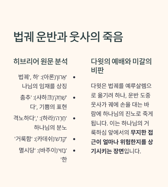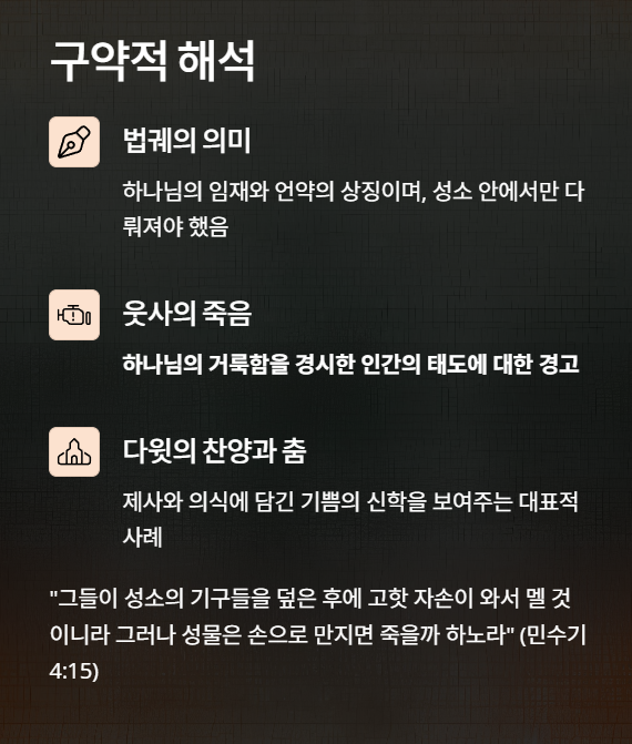 구약의 법궤는 하나님의 임재와 언약의 상징이며, 성소 안에서만 다뤄져야 했습니다. 웃사의 죽음은 하나님의 거룩함을 경시한 인간의 태도에 대한 경고입니다. 동시에 다윗의 찬양과 춤은 제사와 의식에 담긴 기쁨의 신학을 보여주는 대표적 사례입니다. 하나님은 외형이 아닌 진심으로 자신을 경외하고 기뻐하는 자를 기뻐하십니다.