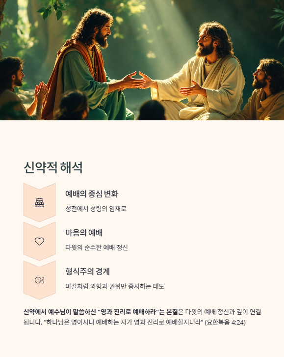신약에서는 예배의 중심이 성전이 아닌 성령의 임재와 진리 안에서의 예배로 옮겨집니다. 다윗의 마음 중심에서 드러난 순수한 예배는, 신약에서 예수님이 말씀하신 “영과 진리로 예배하라”는 본질과 연결됩니다. 또한 미갈처럼 외형과 권위를 중시하는 태도는 오늘날 교회가 경계해야 할 형식주의를 상징합니다.