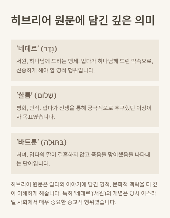 • ‘샬롬’ (שָׁלוֹם) – 평화, 안식. 입다가 추구했던 이상.