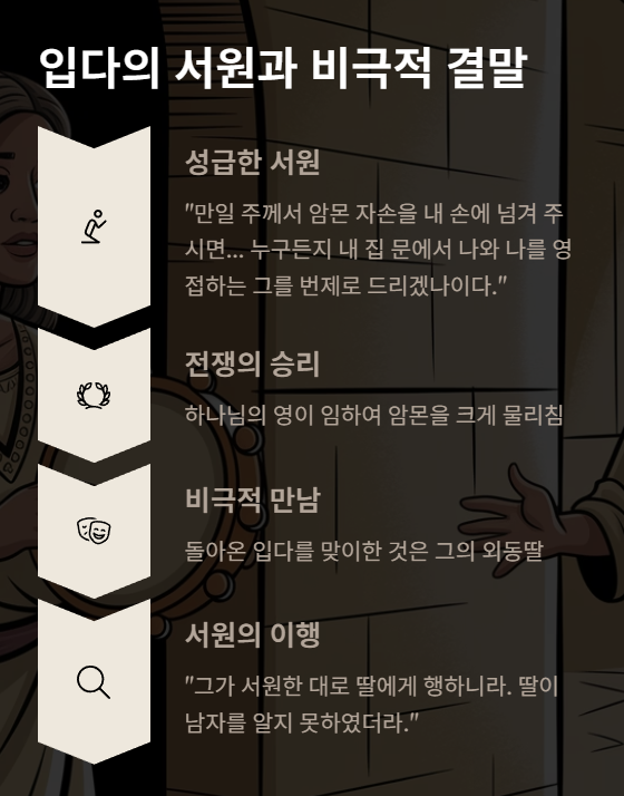 하나님은 승리를 주셨지만, 입다는 자신의 불완전한 신학과 경솔한 열심으로 인해 비극을 자초했습니다.