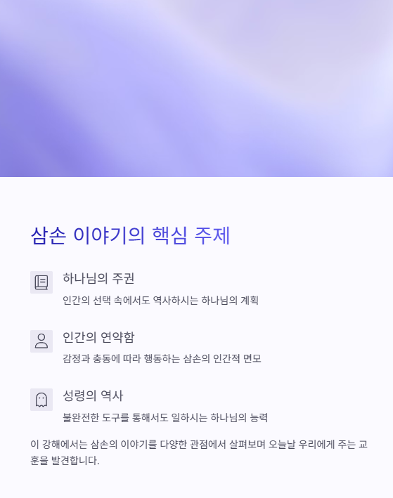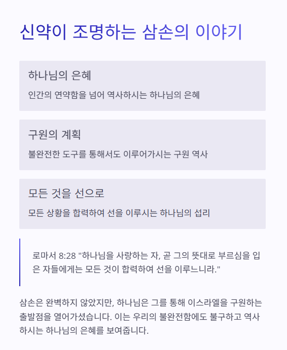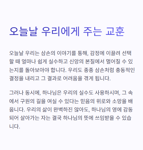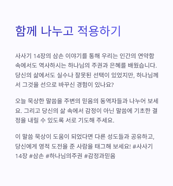 삼손은 완벽하지 않았지만, 하나님은 그를 통해 이스라엘을 구원하는 출발점을 열어가십니다.