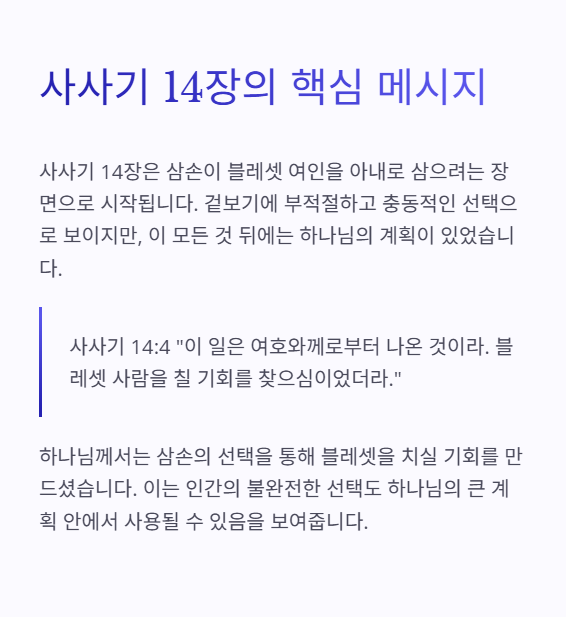 삼손의 선택은 겉보기에 부적절하고 충동적인 것으로 보이나, 하나님께서는 이를 통해 블레셋을 치실 기회를 만드십니다.