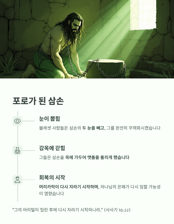 - 이는 삼손의 육체뿐 아니라 영적 어두움과 수치의 상태를 상징합니다.