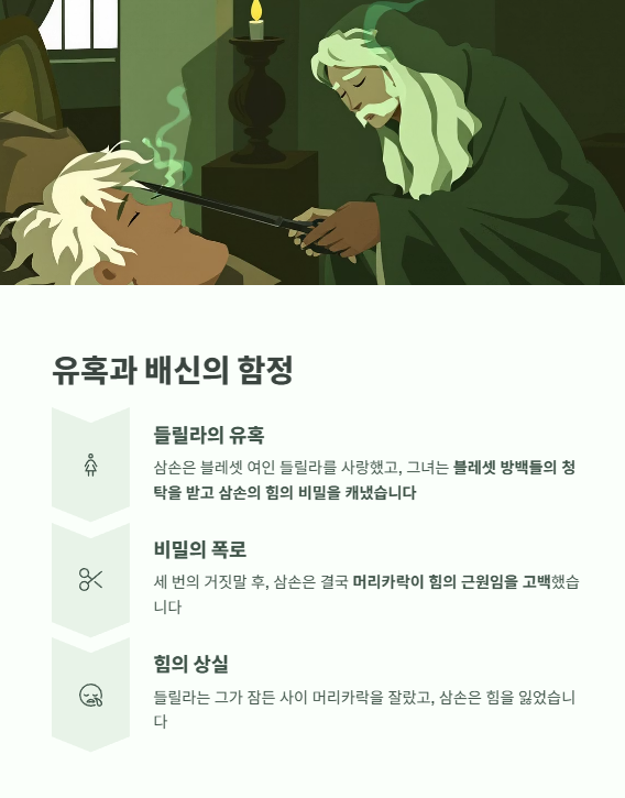 - 들릴라는 그가 잠든 사이 머리카락을 자르고, 삼손은 힘을 잃습니다.