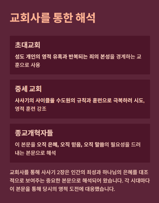 초대교회는 이스라엘의 순환 구조를 통해 성도 개인의 영적 유혹과 반복되는 죄의 본성을 경계했습니다.
