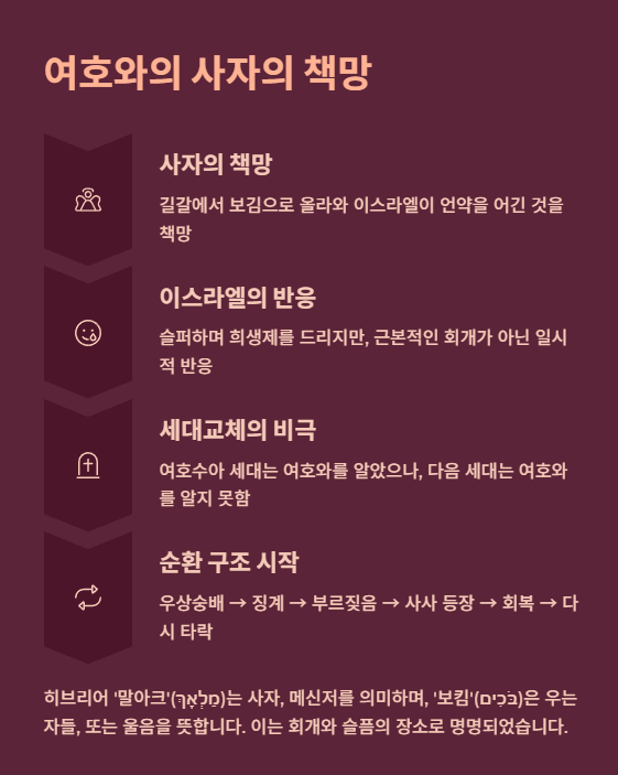 - 사자가 길갈에서 보김으로 올라와, 이스라엘이 언약을 어기고 가나안 족속과 언약을 맺은 것을 책망합니다.