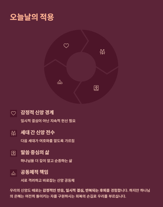 신앙은 세대 간 전수되어야 하며, 다음 세대가 여호와를 알지 못하는 비극을 반복하지 않도록,