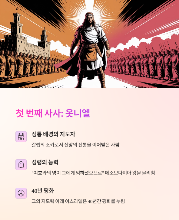 "여호와께서 이스라엘 자손을 위하여 한 구원자를 세우셨으니... 곧 그나스의 아들 옷니엘이라."