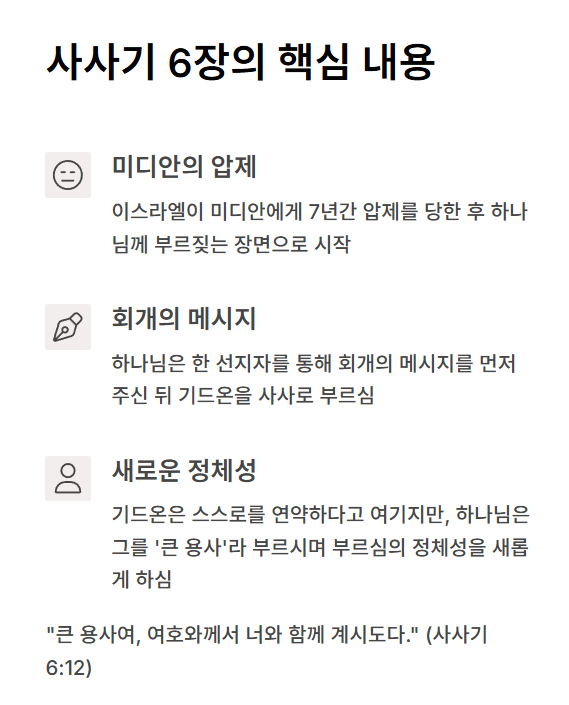 기드온은 스스로를 연약하다고 여기지만, 하나님은 그를 '큰 용사'라 부르시며 부르심의 정체성을 새롭게 하십니다.