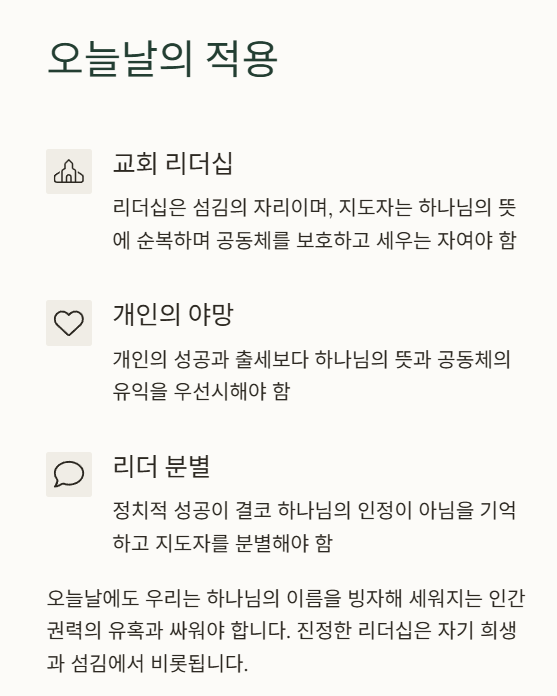 지도자는 하나님의 뜻에 순복하며 공동체를 보호하고 세우는 자여야 합니다.