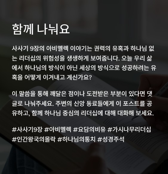 • 이는 아비멜렉의 통치가 결국 파괴를 불러올 것임을 예언한 말씀입니다.