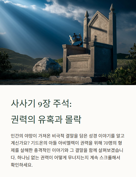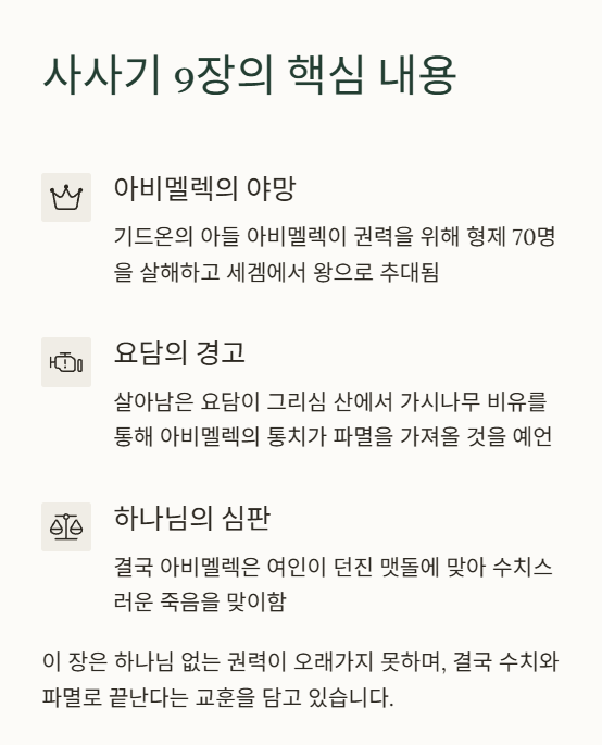 사사기 9장은 기드온의 아들 아비멜렉이 스스로 왕이 되려는 시도와 그 몰락의 과정을 상세히 다룹니다.