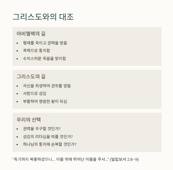 이 사건은 구약에서 인간 중심의 정치 체제와 폭력적 권력이 하나님의 통치 질서를 대체할 수 없음을 보여줍니다.