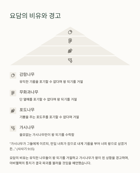 • 요담은 그리심 산에서 비유를 말하며, 유익한 나무(감람, 무화과, 포도)가 왕 되기를 거절하고 가시나무가 왕이 된 상황을 경고합니다.