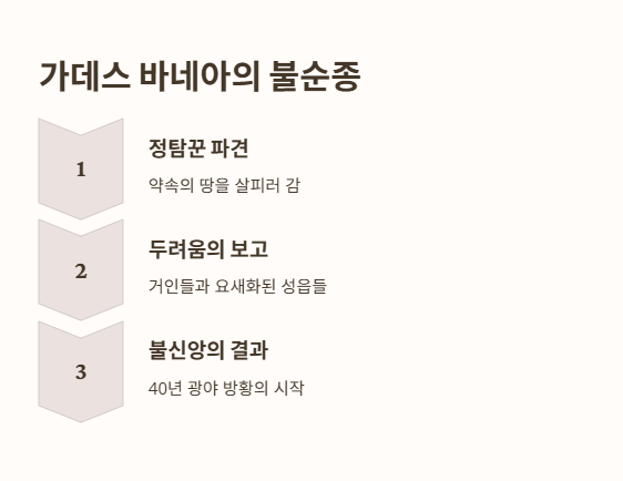 모세는 1장에서 하나님께서 어떻게 출애굽 후 가데스 바네아까지 인도하셨는지를 회고합니다. 특히 **가나안 정탐 사건(1:19-46)**을 강조하며, 하나님을 신뢰하지 않고 두려워했던 과거의 불순종이 그들의 운명을 어떻게 바꾸었는지를 보여줍니다.