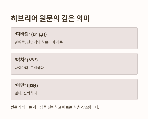 - ‘디바림’ (דְּבָרִים) – 말씀들. 신명기의 히브리어 제목이며, 단수 ‘다바르’는 말씀, 사건, 일 모두를 의미.