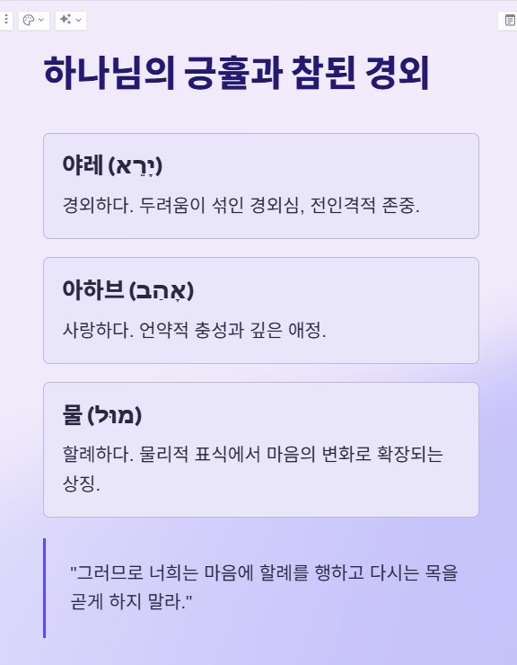 또한 하나님을 경외하는 삶은 단순한 두려움이 아니라 사랑과 정의, 긍휼을 실천하는 윤리적 태도로 확장됩니다.