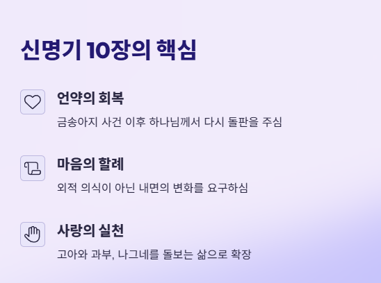- 언약궤와 레위인의 사역도 다시 언급되며, 중보자 모세와 언약의 역할이 강화됩니다.