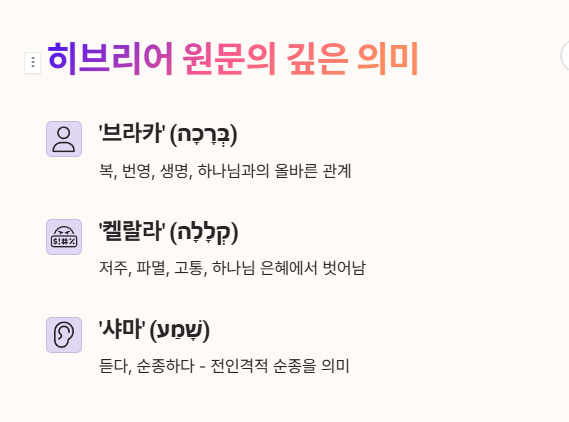• ‘샤마’ (שָׁמַע) – 듣다, 순종하다. 청종은 단순한 청취가 아닌 전인격적 순종.
