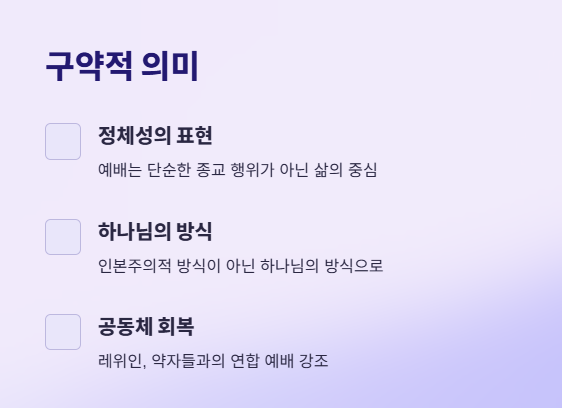 - 레위인, 고아, 과부, 객 등과 나누는 연대적 예배가 강조됩니다.