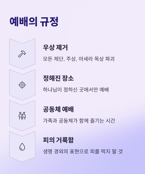 이스라엘 백성은 이방인의 산당과 우상 숭배 흔적을 철저히 제거하고, 여호와께서 택하신 곳에서만 예배를 드릴 것을 명령받습니다.
