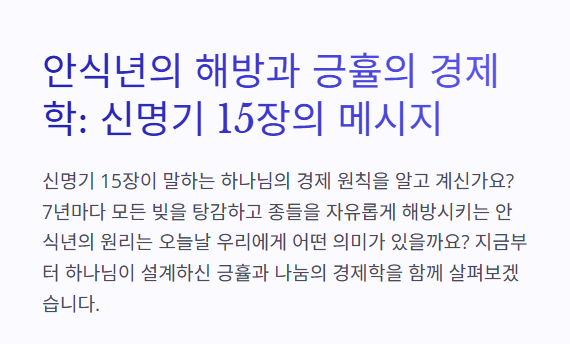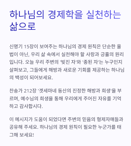 이 장은 율법이 단지 종교적 규례가 아니라, 사회 정의와 공동체 회복을 지향하는 실제적 제도임을 보여줍니다.