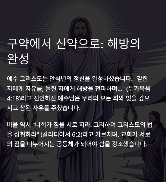 채무 면제와 종 해방은 하나님이 주시는 ‘쉼’의 정신이 공동체 삶 속에 구현된 모습입니다.