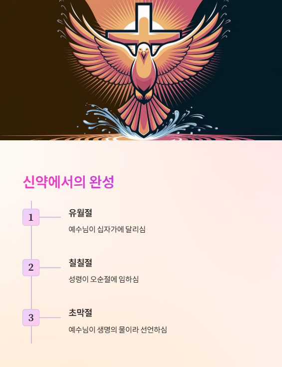 예수님은 유월절에 십자가에 달리셨고, 성령은 오순절(칠칠절) 때 임하셨으며, 초막절의 물 뿌림 예식 중 자신이 생명의 물이라 선언하셨습니다.
