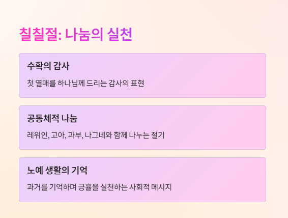 - 수확의 기쁨을 하나님께 감사드리며, 레위인과 고아, 과부와 나그네와 함께 나누는 절기입니다.