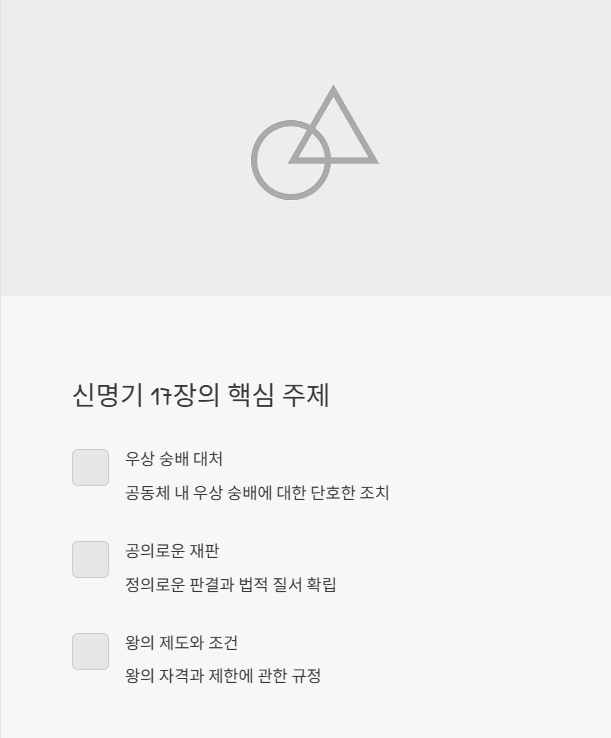신명기 17장은 공동체 내에서의 우상 숭배에 대한 단호한 대처, 재판의 공의성 확보, 왕의 제도와 조건에 관한 규정을 담고 있습니다.