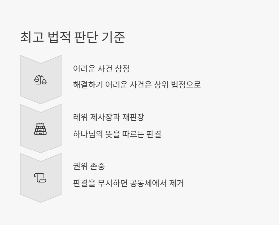 - 어려운 사건은 레위 제사장과 재판장이 있는 곳으로 가져가야 하며, 그들의 판결은 하나님의 뜻을 따르는 것으로 존중해야 합니다.