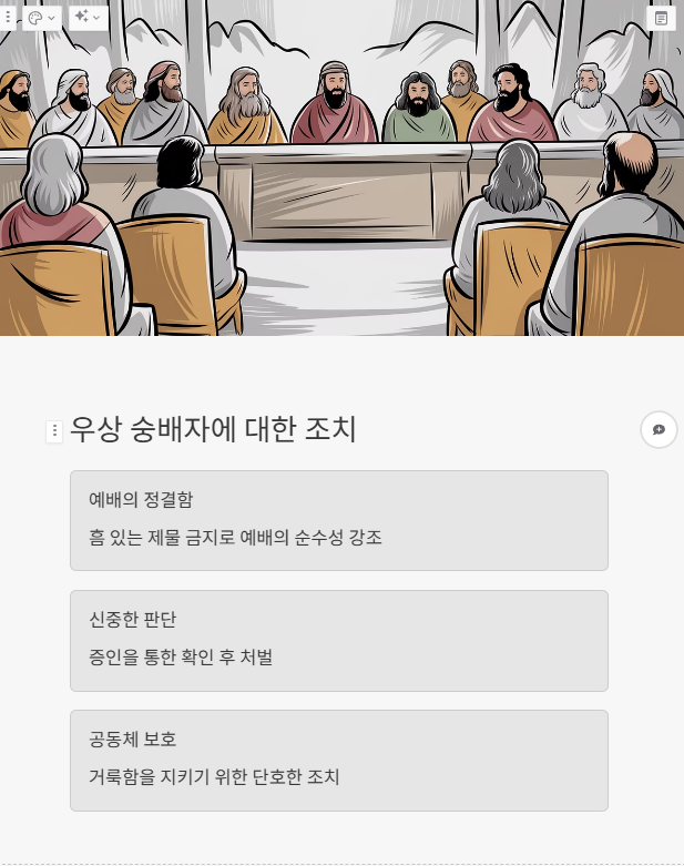 또한 우리는 매일의 삶 속에서 진리 앞에 바로 서며, 삶의 기준을 말씀에 두고, 우상적 요소를 단호히 배제하는 거룩함을 실천해야 합니다.