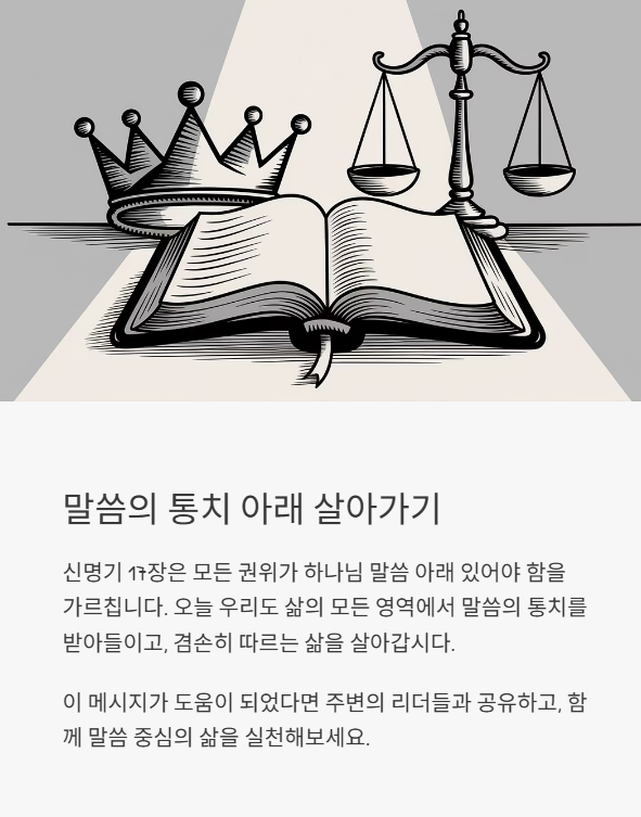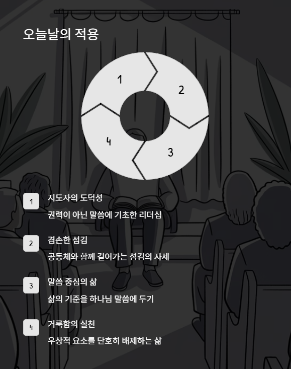 지도자는 권력이 아니라 하나님의 말씀을 옆에 두고, 공동체와 함께 걸어가는 겸손한 섬김자이어야 합니다.