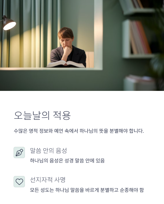 오늘날도 설교자와 교사는 하나님의 음성을 바르게 전하고, 거짓 영에 미혹되지 않도록 성도들을 분별로 이끌 사명이 있음을 강조합니다.
